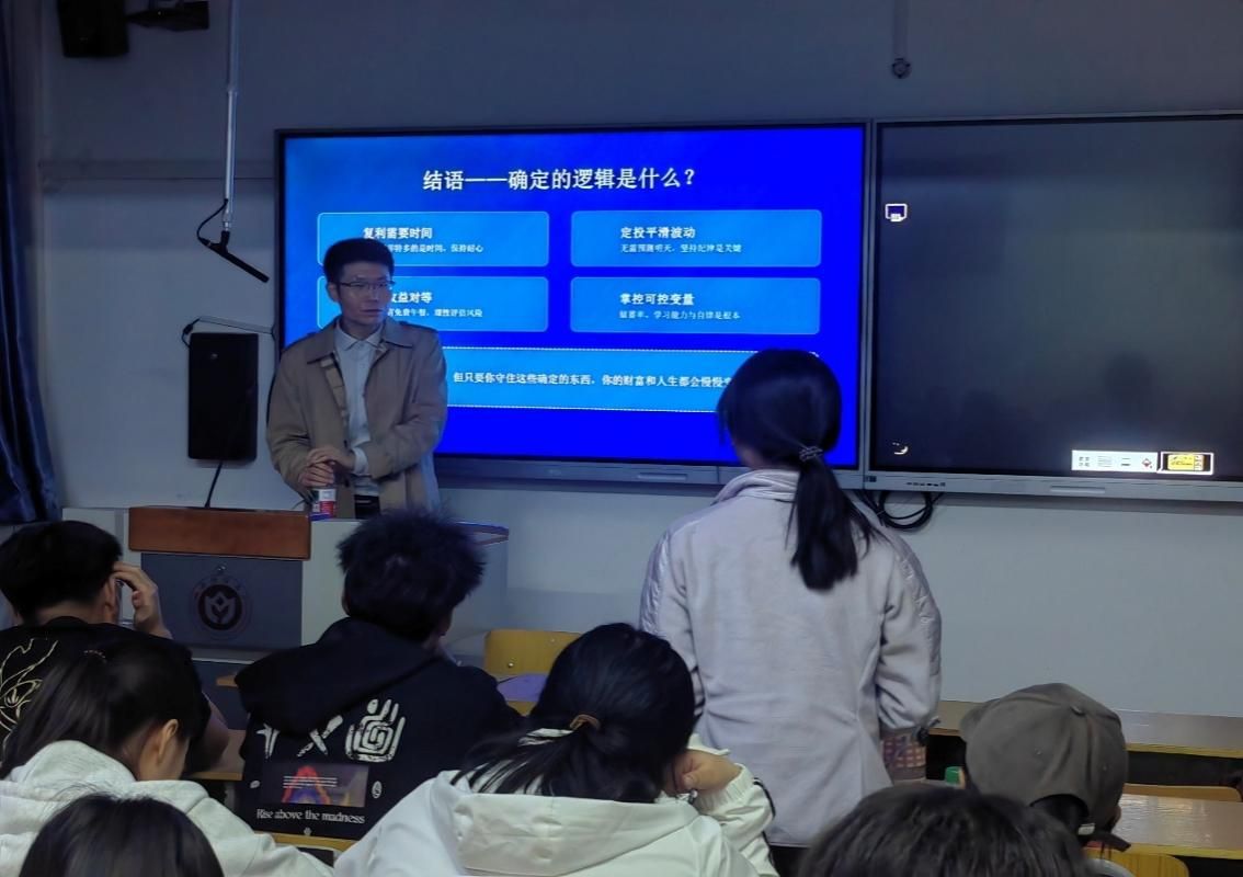 讲座现场,主讲人跳出传统“存钱理财”的狭隘认知,围绕大学生日常消费规划、校园金融风险识别、基础财富逻辑构建、合法理财渠道科普、青年金融反诈避险等核心内容,层层递进地开展财商知识普及。结合资本市场真实案例、校园高频金融陷阱及年轻人财富成长路径,毕经理以通俗易懂的语言拆解复杂金融知识,系统讲解了财富积累的底层逻辑、理性消费原则、借贷风险边界及个人信用保护要点,深刻剖析了当代大学生树立正确财商观、筑牢金融安全防线的重要意义。